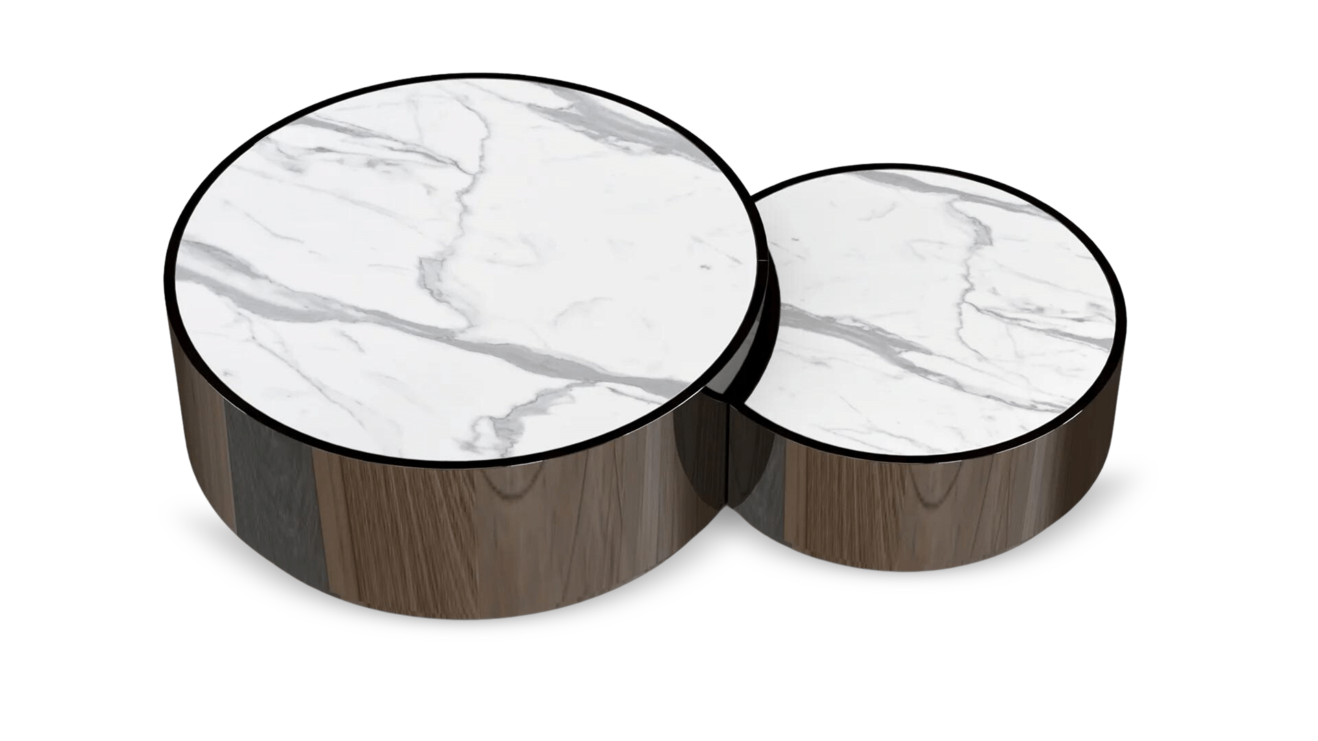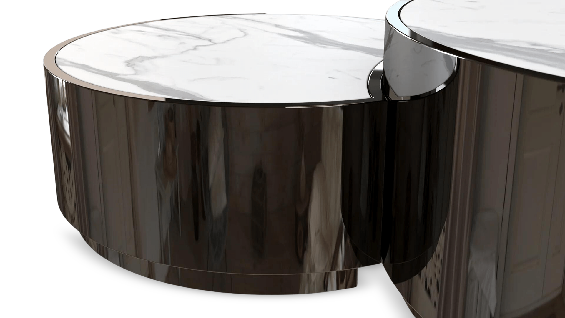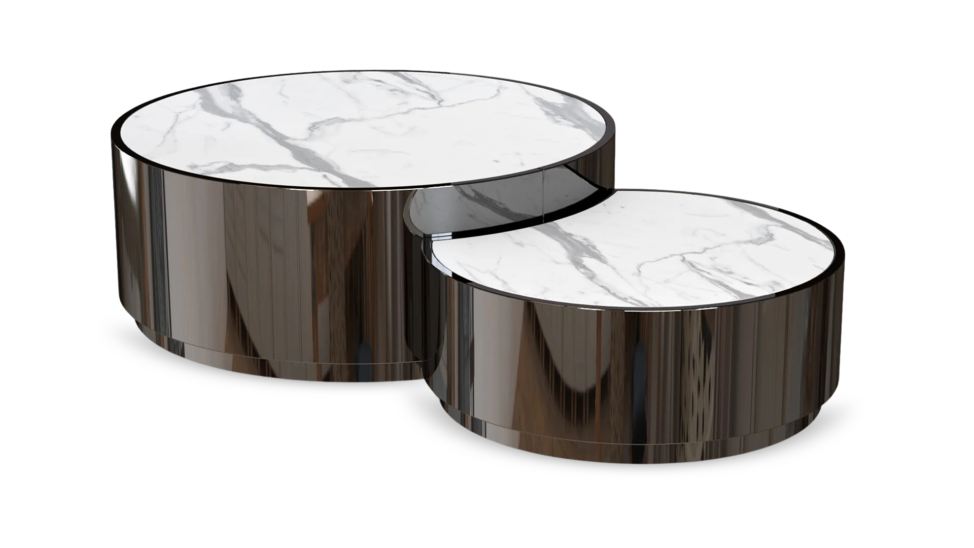 Create a focal point for guests to gather around while entertaining with this Yin Coffee Table. The table sits low to the ground and features two circular pieces, one larger than the other. Both sections feature polished chrome exteriors and marbled tops.