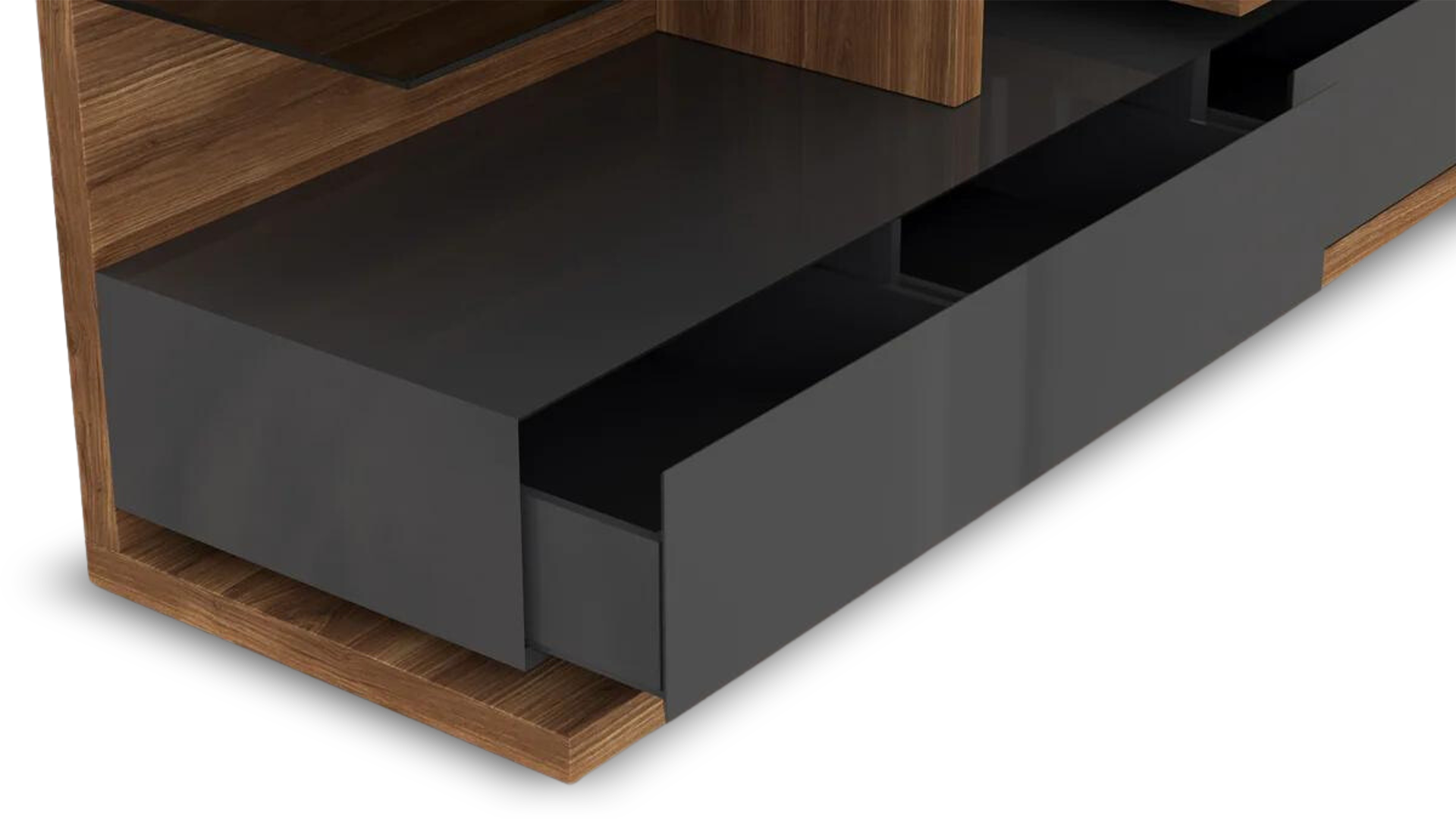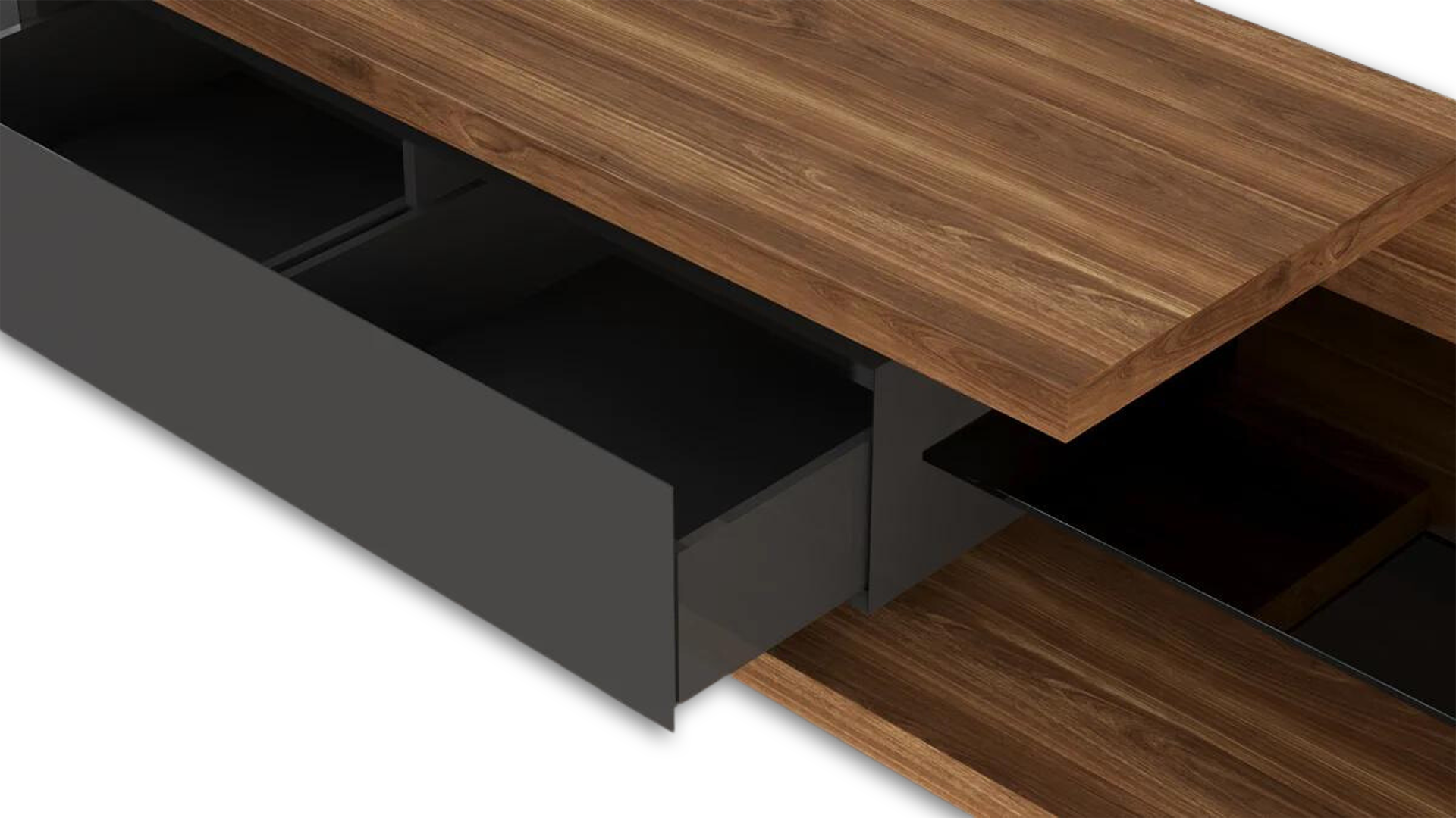 veneer wood frame, glossy white lacquer accents, and over six compartments for ample storage.